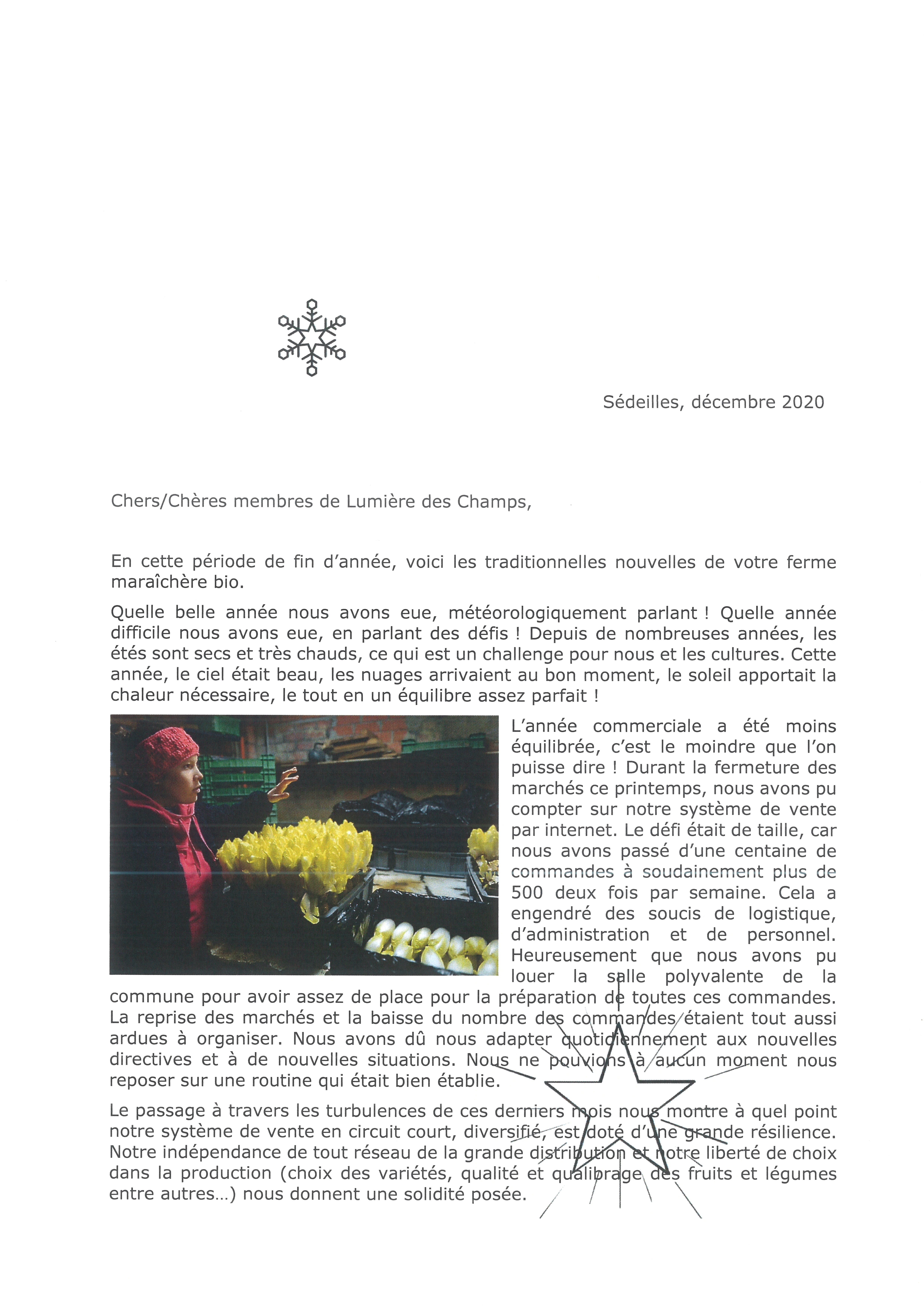 Lumière des Champs agit pour l'Agriculture Contractuelle de Proximité (ACP) en proposant des abonnements à des paniers hebdomadaires de légumes, ainsi que des abonnements complémentaires, le tout local, de saison et biologique.